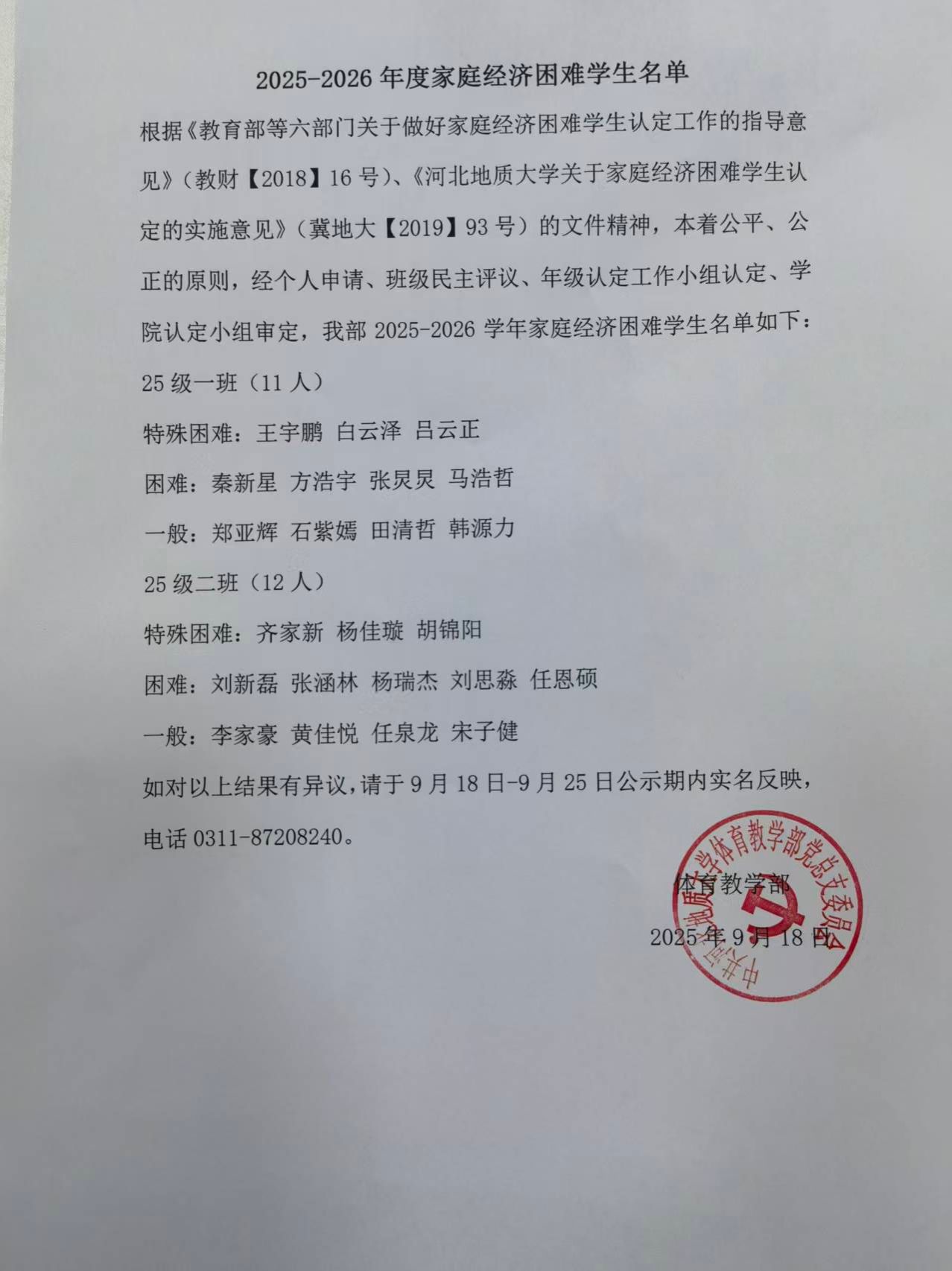 2025-2026年度家庭经济困难学生名单公示(25级)